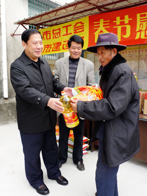 會后,市總工會、市建設局向湖邊村貧困村民發(fā)放大米和食油等物品,并向該村干部群眾致以新春的問候。