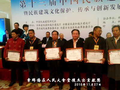 這是繼今年年初,章綿僑以其設(shè)計(jì)并承建的“福建省浦城縣南峰寺功德院章仔鈞、練夫人紀(jì)念堂”,榮獲中國(guó)民族建筑研究會(huì)第四屆代表大會(huì)頒發(fā)的唯一的一個(gè)“中國(guó)民族優(yōu)秀建筑”獎(jiǎng),并獲“中國(guó)民族建筑事業(yè)優(yōu)秀人物”稱號(hào)后,第三次在全國(guó)民族建筑界榮獲殊榮。