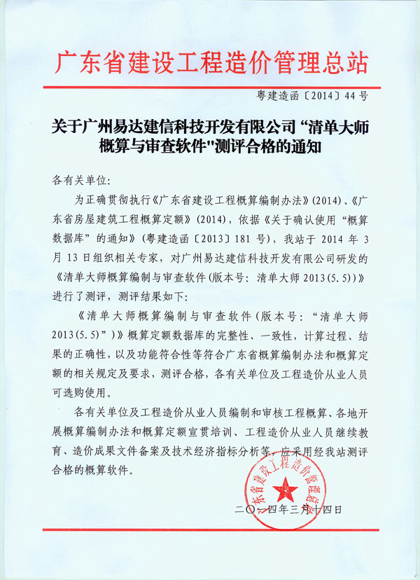 關(guān)于廣州易達(dá)建信科技開(kāi)發(fā)有限公司“清單大師概算與審查軟件"測(cè)評(píng)合格的通知