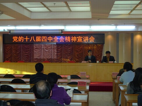 陳曉東主任的輔導報告緊扣十八屆四中全會的主要內容和精神內涵,重點宣講了四個方面的內容:一是深刻認識黨的十八屆四中全會的重大意義和在新的歷史起點上全面推進依法治國重要性;二是深刻理解習總書記執(zhí)政背景下的黨的十八屆四中全會全面推進依法治國的指導思想、總體目標、基本原則以及全面推進依法治國的各項任務和重大舉措;三是《中共中央關于全面推進依法治國若干重大問題的決定》的主要內容、深刻內涵;四是黨的領導是社會主義法治最根本的保證,全黨同志和全國人民要積極投身到全面推進依法治國偉大實踐中,開拓進取,扎實工作,為建設法治中國而奮斗。宣講報告既有理論上的深入分析和說理,又有廣征博引的案例分析,鮮明的事實論證,深深地吸引著與會人員,使大家深受啟發(fā)。