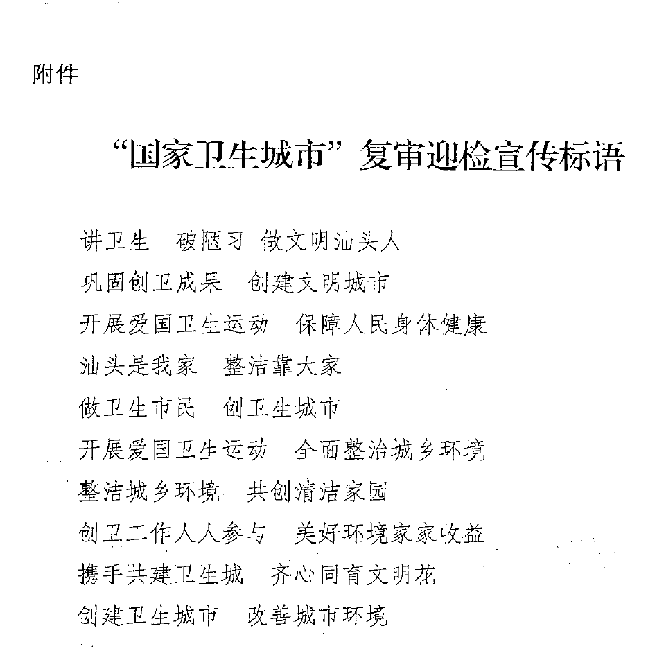 附件:“國(guó)家衛(wèi)生城市”復(fù)審迎檢宣傳標(biāo)語(yǔ)