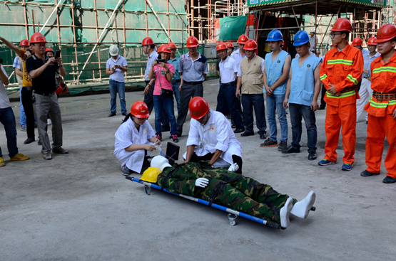 高空墜落救援演練過程分別模擬施工現(xiàn)場發(fā)生工人從高處墜落,傷者頭部、臂部受傷,項目部啟動應急救援預案;中毒應急救援演練模擬工人發(fā)生中毒現(xiàn)象,項目部啟動消防應急救援預案的情況。在整個演練過程中,救援小組能按照預案流程要求,通力協(xié)作,有條不紊地開展救援工作,演練活動取得圓滿成功。