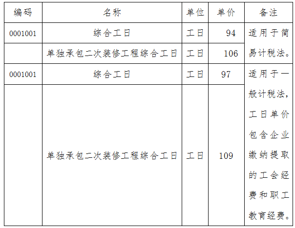 營業(yè)稅改征增值稅后 ,我市中心城區(qū)建設(shè)項目定額人工工日單價可參照下表執(zhí)行: