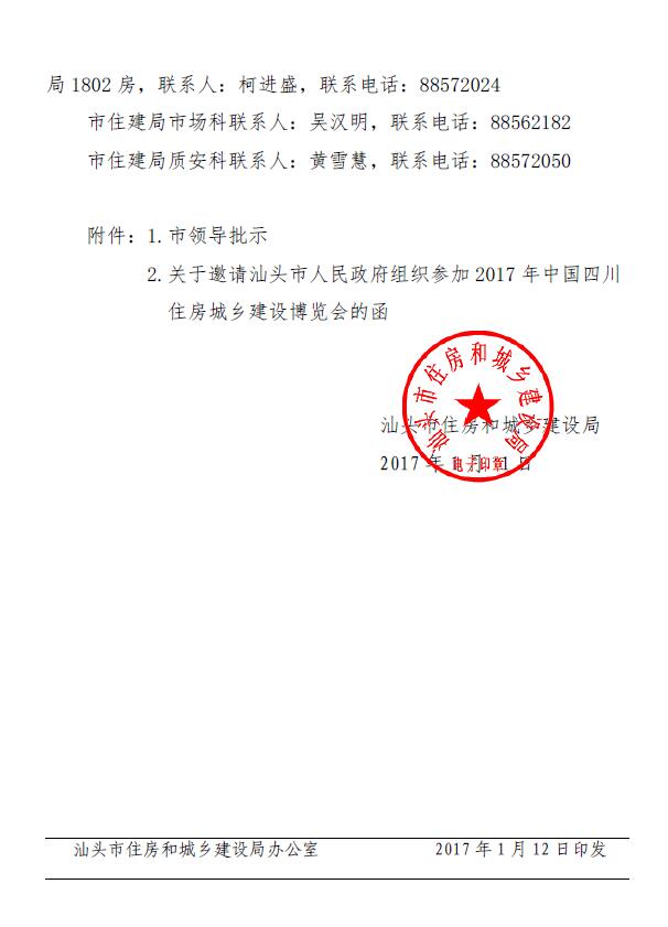 轉(zhuǎn)發(fā)關(guān)于邀請(qǐng)汕頭市人民政府組織參加 2017 年中國(guó)四川住房城鄉(xiāng)建設(shè)博覽會(huì)的函汕住建函〔2017〕15 號(hào)